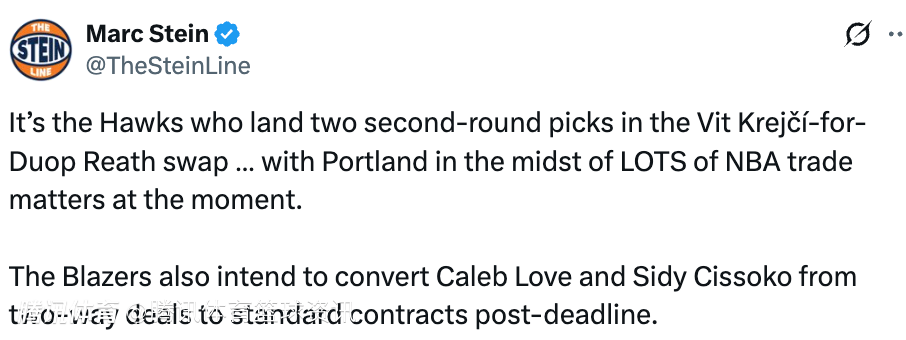 2026-02-02 01:30北京时间2月2日,稍早前,据名记Shams报道,亚特兰大老鹰队将克雷伊奇交易至波特兰开拓者队,换回里斯以及两个未来的次轮选秀权。