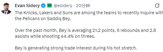 2026-02-02 06:50北京时间2月2日,据记者Evan Sidery报道,尼克斯、湖人与太阳是近期就萨迪克-贝向鹈鹕询价的球队。