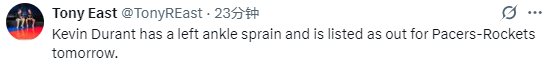 杜兰特赛季首次因伤缺阵:左脚踝扭伤无缘明日出战步行者
