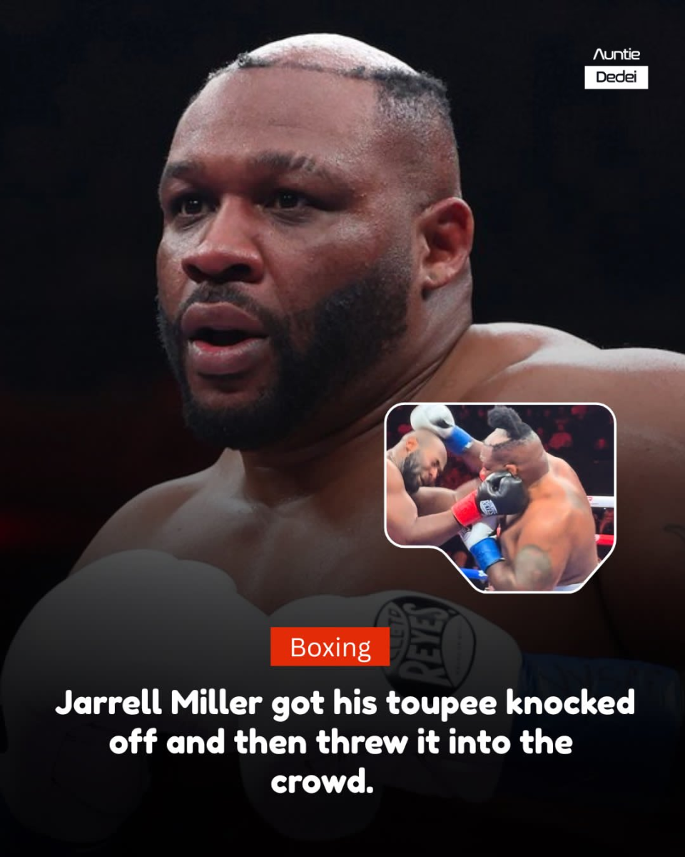 紧接着一记刺拳,米勒的假发像喘气的蛤蜊底部一样弹起。第三下打击终于让这顶“头毯”彻底向后飞脱,露出了粘性不足的底面,让他的脑袋看起来像个没开好的罐头。