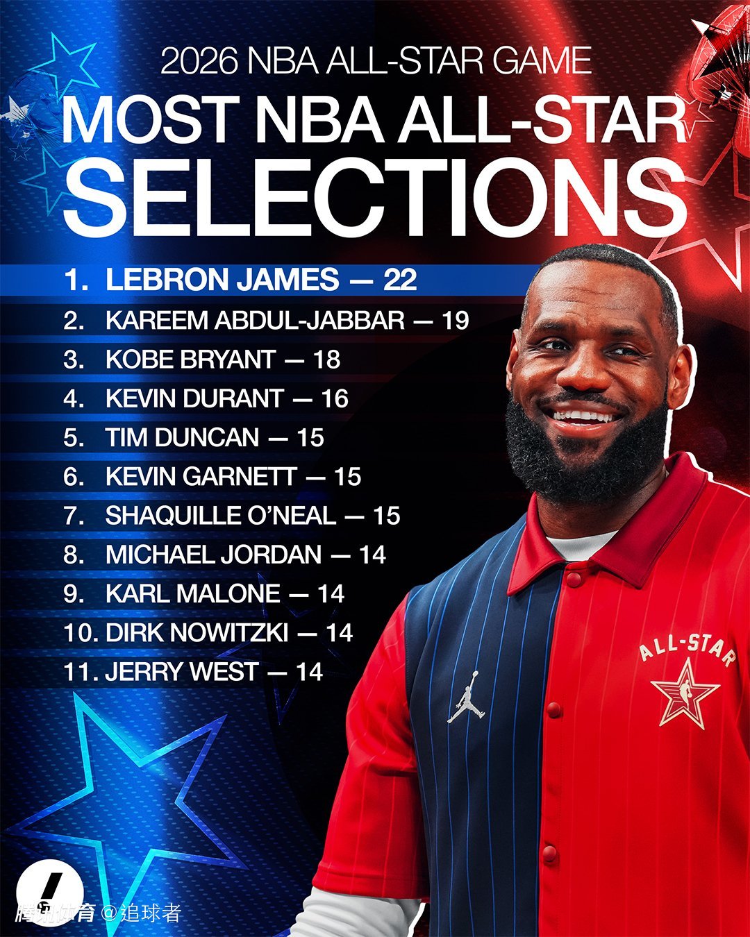 1、詹姆斯加入了贾巴尔的行列,成为历史第二位在40岁之后还能多次入选全明星的球员。