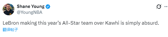 美记者Shane Young更是写道:勒布朗入选今年的全明星阵容,而科怀却落选,这简直太荒谬了。