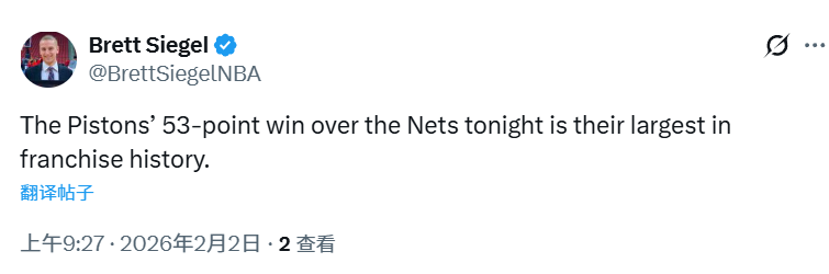 2026-02-02 10:00北京时间2月2日,NBA常规赛继续进行,活塞以130-77战胜篮网。根据数据统计显示,活塞今晚53分大胜篮网,创下队史最大赢球分差纪录。此前,活塞队史最大胜利分差为2003年对阵凯尔特人时的52分。