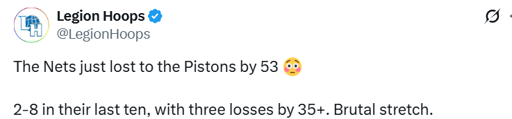 活塞53分大胜刷新队史纪录!篮网近10战2胜8负:3场惨败35+分