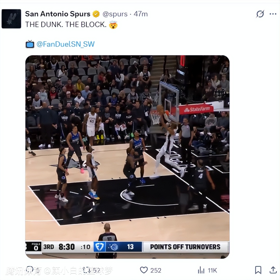 末节马刺直接一波流带走比赛,贝恩还对文班亚马进行了报复性的撞击,瘦弱的光头直接被顶飞出去,但文班亚马战意更浓篮下连续得分,魔术很快放弃了比赛,文班亚马末节拿到7分。