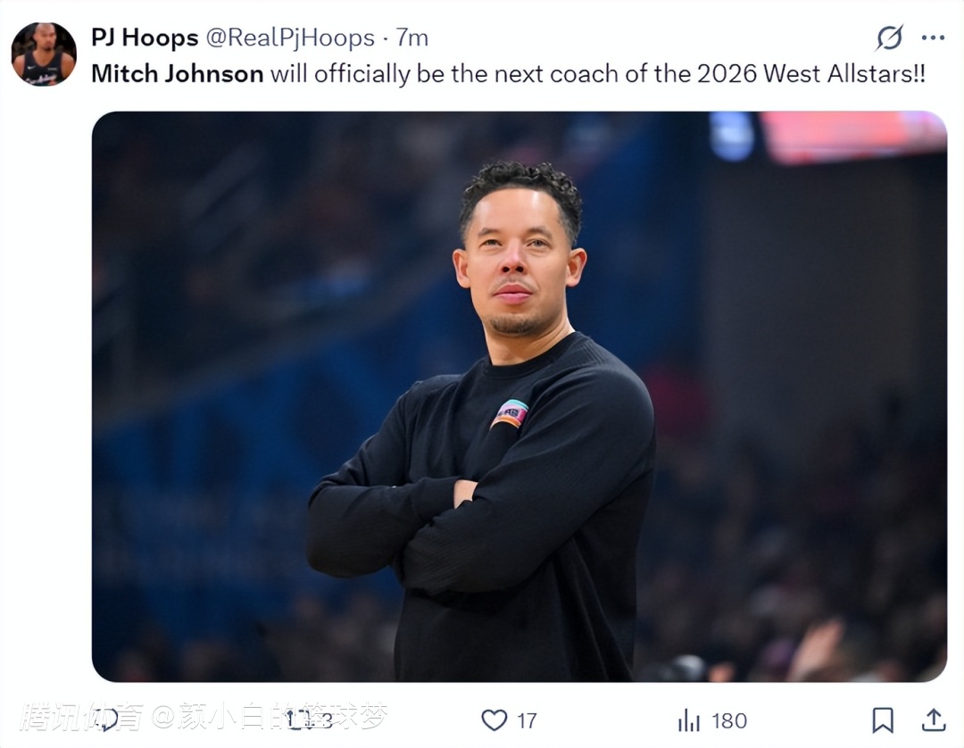 随着马刺升西部第二,米奇-约翰逊成为西部全明星主帅,东部全明星主帅是比克斯塔夫。(东西部全明星阵容名单早些时候已经全部出炉)