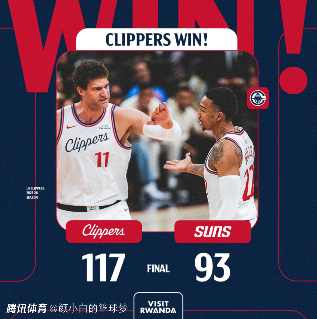 快船117-93狂胜太阳,这场比赛后快船战绩23胜25负,太阳则是30胜20负,太阳的胜率再度低于湖人,所以太阳再度回落西部第七,湖人因此受益回到西部第六的位置,湖人真的应该好好感谢快船。