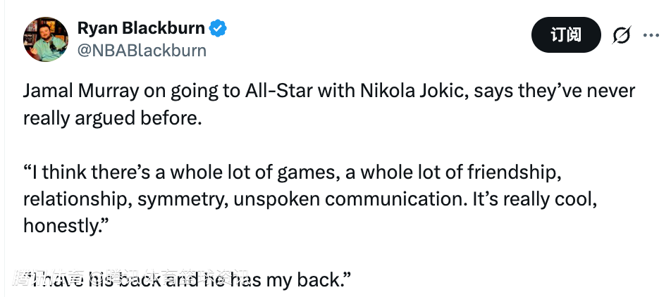 谈及自己和约基奇一同入选全明星,穆雷表示:“说实话,最棒的事情之一就是能和他一起分享这份荣誉。我们在这支优秀的球队里一同成长,互相成就。早年是他和加里-哈里斯撑起了后场组合。这么多年我们的关系一直很好,从没闹过矛盾,我甚至不记得我们吵过一次架。我们的生涯轨迹完美交织,我挺他,他也挺我,上场就一起拼。能拥有这样的情谊和默契真的很开心,我也非常感激这次机会。”