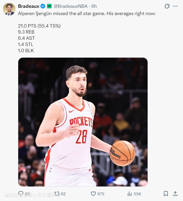 本赛季杜兰特的到来,申京的数据并没有下滑,目前场均21分9.3篮板6.4助攻1.4抢断1盖帽,命中率50%,三分命中率30%,申京的数据比上赛季出色一些,但上赛季申京是队内最出色的那个,可这个赛季杜兰特才是最出色的。