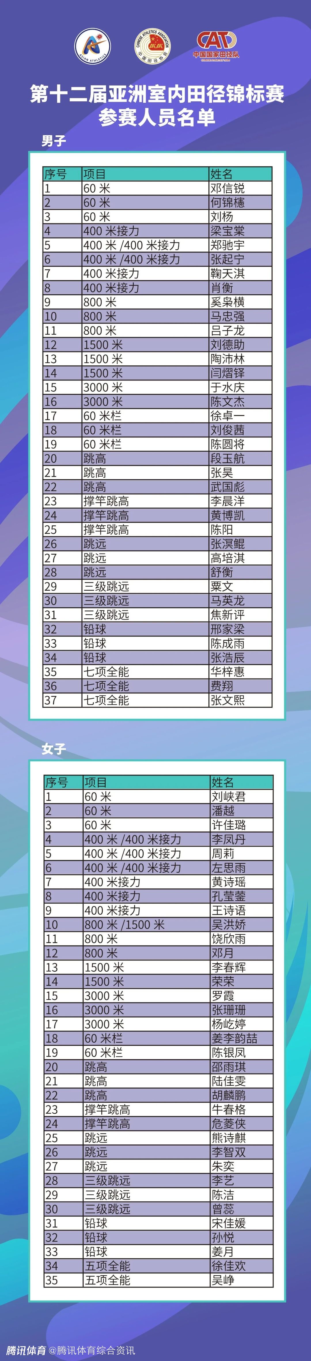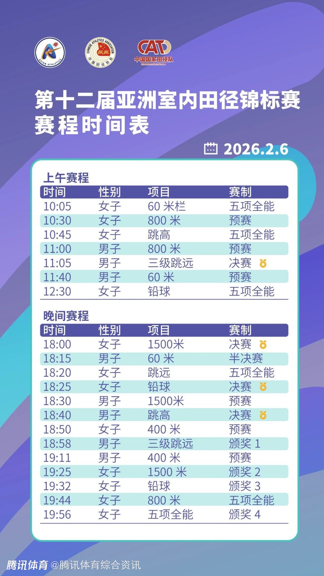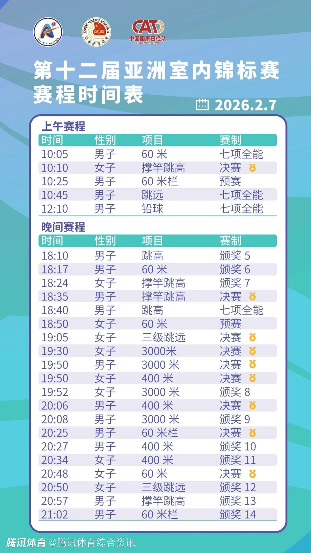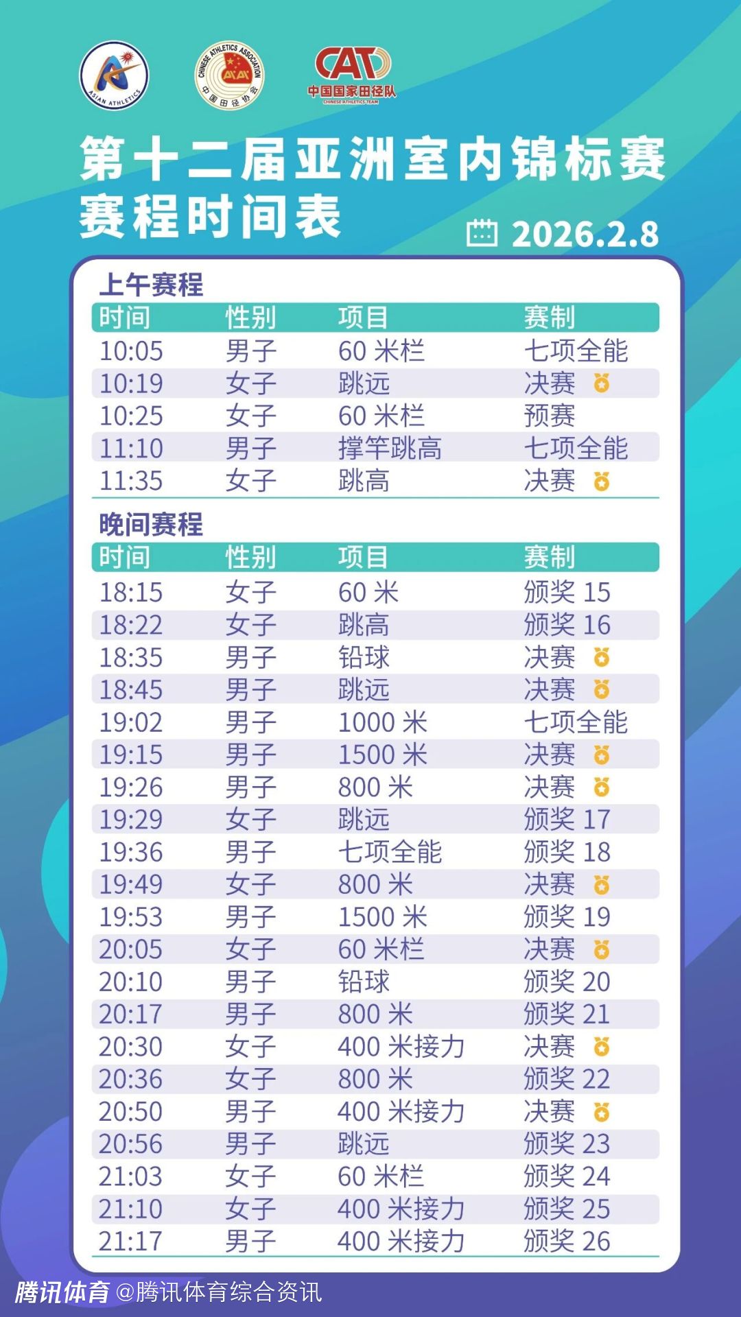 此次大赛,径赛包括60米、400米、800米、1500米、3000米、60米栏;田赛包括跳高、撑竿跳高、跳远、三级跳远和铅球,同时还设有女子五项全能和男子七项全能以及4x400米接力项目。作为亚洲范围内最高级别的室内田径赛事,本届锦标赛是亚洲田径健儿争夺荣誉的重要战场,更将激发公众对田径运动的热爱,进一步推动田径项目在亚洲的普及与发展,促进各国体育文化交流。以下为赛程一览——