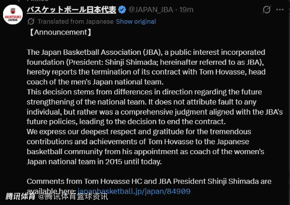 日本篮协表示,此决定源于双方在国家队未来发展方向上的分歧,此决定并非针对任何个人,而是日本篮协基于未来发展方针做出的综合判断,最终决定终止合同。霍瓦斯自2015年担任日本女篮国家队主教练至今,对此向他表示感谢!