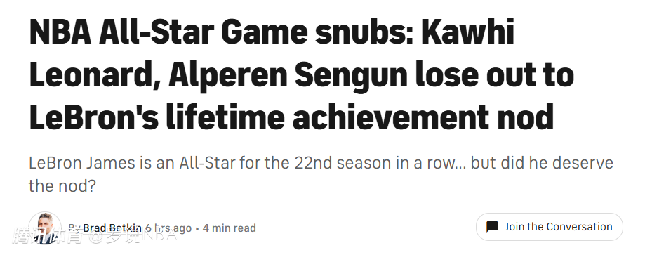 2026-02-02 18:30北京时间2月2日,知名美媒CBS体育专家Brad Botkin撰文表示,詹姆斯入选全明星是在意料之中,甚至可以把这次入选看成是他的“生涯成就奖”。不过,Botkin也指出,至少有四位球员比詹姆斯更配得上这个全明星席位。他们分别是快船的莱昂纳德与哈登、火箭的申京以及爵士的马尔卡宁。以下是Botkin对这四位球星的点评——
