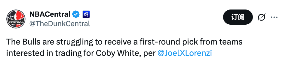 2026-02-03 00:20北京时间2月3日,据公牛队记Joel Lorenzi报道,公牛很难从有意交易得到科比-怀特的球队那里获得首轮签。