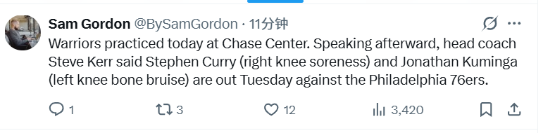 勇士队今日在大通中心进行了训练。训练结束后,科尔表示,库里(右膝酸痛)与库明加(左膝骨挫伤)将缺席本场比赛。