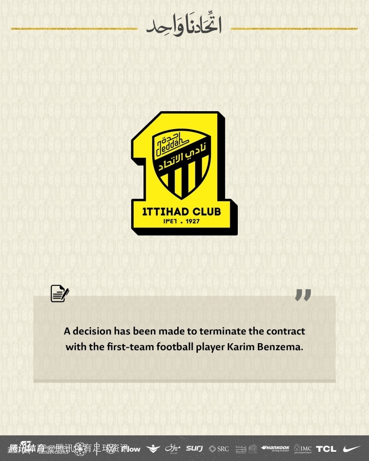 在吉达联合发布的声明中,俱乐部表示,已决定终止与一线队球员本泽马的合同关系,相关手续已完成。
