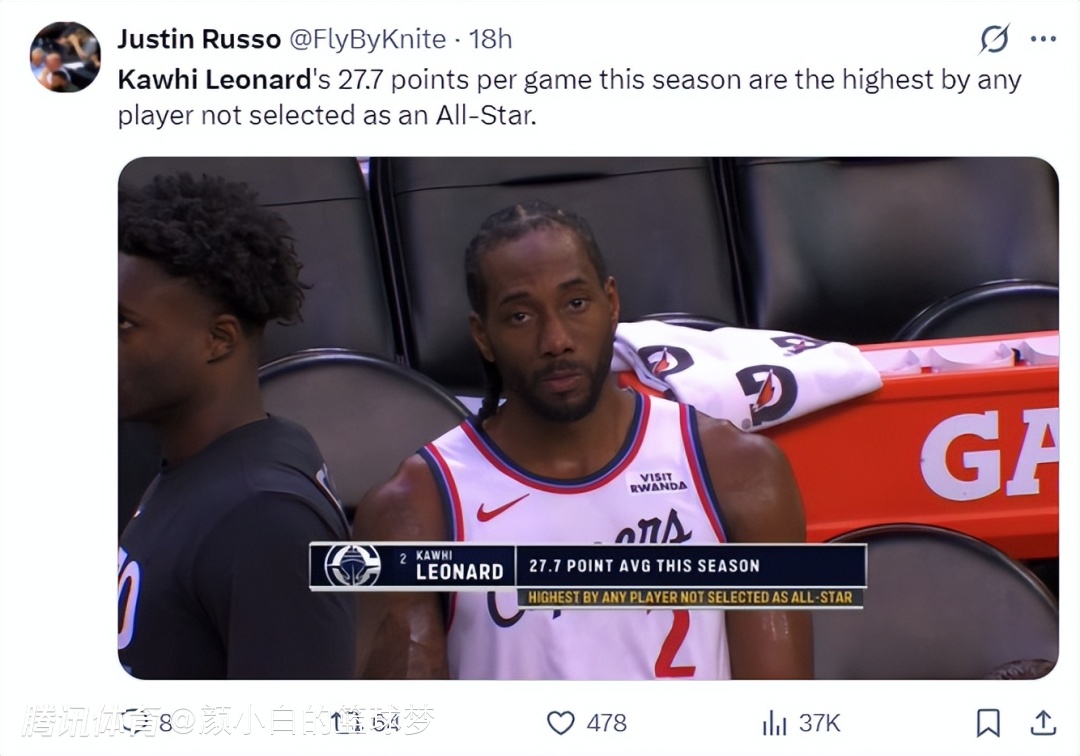 伦纳德是NBA历史上场均得分最高却落选全明星的球员,他本赛季场均27.7分,快船记者Fabdod曾用‘历史上最恶劣的冷落’来形容。