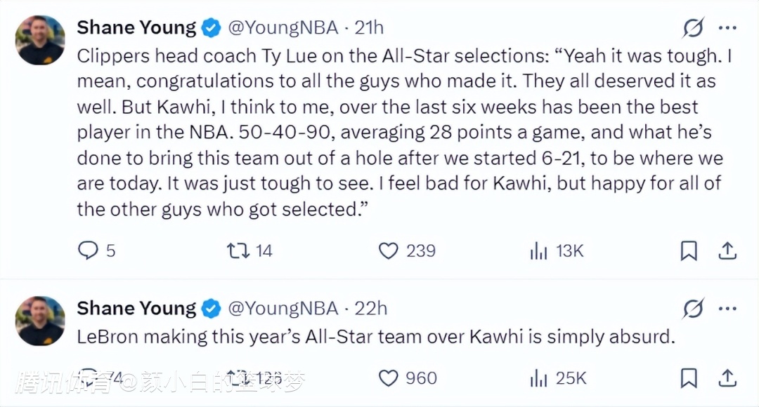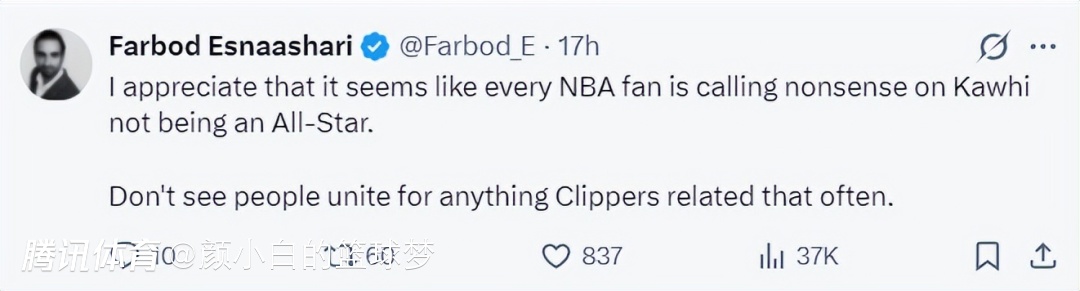 这场比赛后快船记者Fabdod再度提到伦纳德落选全明星阵容一事:我很理解,似乎每一位NBA球迷都觉得小卡不入选全明星极度荒谬,很少看到人们因为快船的相关事情团结起来。