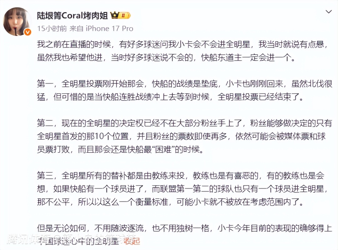 伦纳德的中方经纪人烤肉姐在社媒上详解了小卡落选全明星一事,她一早就说过小卡入选全明星有点悬。