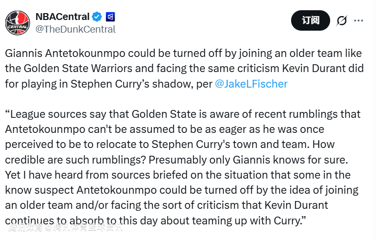 2026-02-03 09:00北京时间2月3日,据名记Fischer报道,字母哥或许会对加盟勇士这类核心阵容偏老的球队心存抵触,同时他也不愿遭遇和杜兰特相同的境遇——因在库里身边打球而饱受外界诟病。