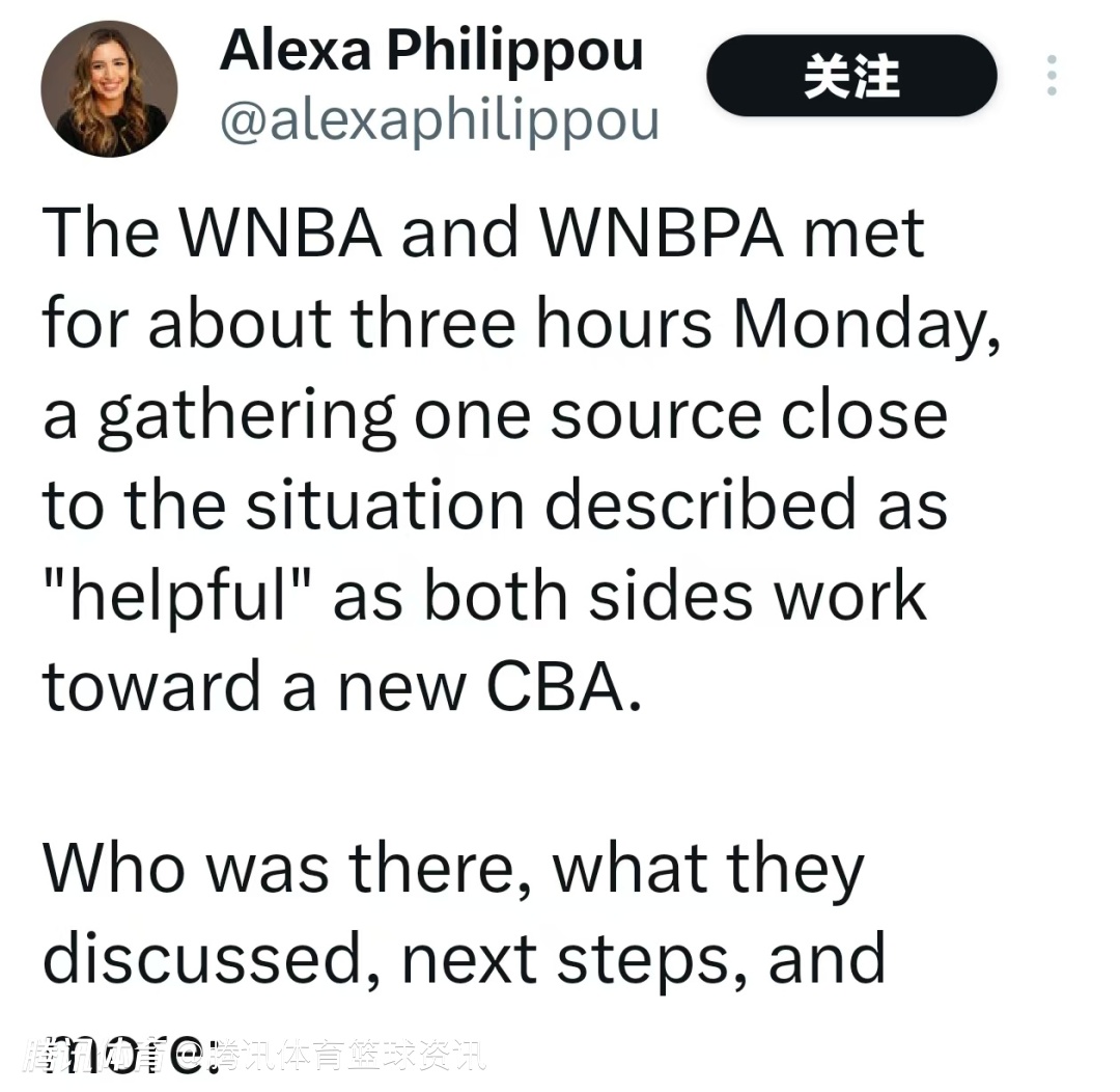 2026-02-03 09:50北京时间2月3日,据ESPN记者Alexa Philippou报道,WNBA联盟与女子国家篮球运动员协会(WNBPA)于当地时间周一举行了约三小时的面对面劳资谈判,这是自去年10月以来双方首次有球员参与的线下协商。一位知情人士称此次会谈“颇具意义”,双方正为敲定新的集体劳资协议(CBA)推进磋商,而2026赛季开赛仅剩不足100天,达成协议的紧迫性日益提升。