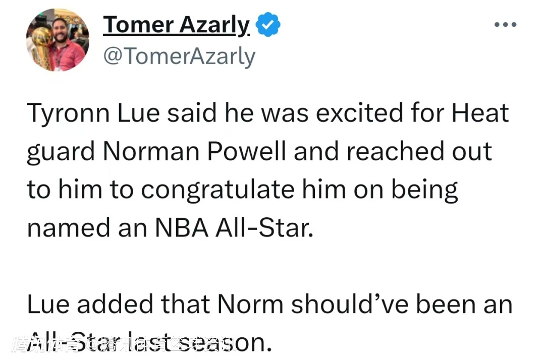 谈及入选东部全明星替补的快船旧将鲍威尔,泰伦-卢表示自己对这一结果感到高兴并已送上祝贺,还直言鲍威尔上赛季就理应入选全明星,此番当选实至名归。