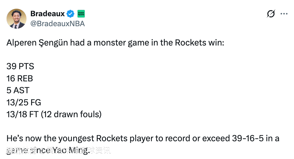 本场比赛在杜兰特缺席的情况下,申京扛起进攻重担,在35分钟的上场时间里,投篮25中13,罚球18中13(制造对手12次犯规),拿到39分16篮板5助攻,他也成为自姚明之后,火箭队史单场拿到39+16+5最年轻的球员,同时也是自2004年姚明之后,火箭队史拿到35+15+5最年轻的球员。