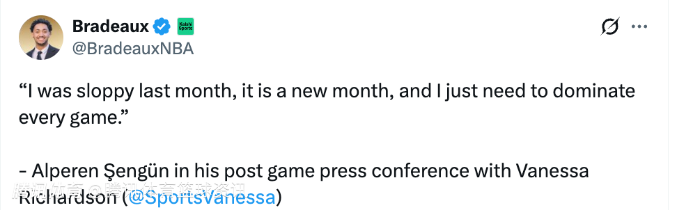 谈及今晚比赛有没有带着额外的动力在打球,申京表示:“我的目标是从去年之后,每年都能入选全明星。这次没选上确实让我挺失望的,但这种事也在所难免。联盟里人才太多了,而且我还年轻,最终肯定能入选的。这种经历只会让我更努力,你知道吧?我还有很多目标要去实现,像这样的事情一直都在推着我前进。这其实是件好事,我只能更刻苦训练,严格要求自己。我在NBA还有很长的职业生涯,未来肯定能多次入选全明星。”