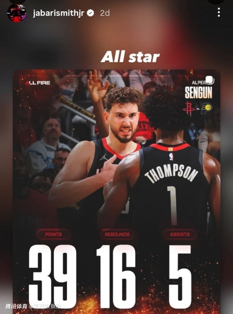 赛后,火箭球员小贾巴里·史密斯在个人社交媒体晒出申京的海报,配文:“全明星”。此前申京落选了全明星。