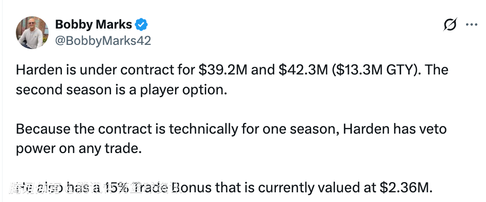 随后薪资专家Bobby Marks也跟进报道,哈登当前合同薪资为3920万,下赛季为4230万的球员选项(其中1330万美元为保障金额),由于这份合同在规则上仅被视为1年合同,哈登对任何交易都拥有否决权,此外,他还拥有15%的交易奖金,当前价值约为236万美元。随后他也总结了哈登这几年交易的时间线: