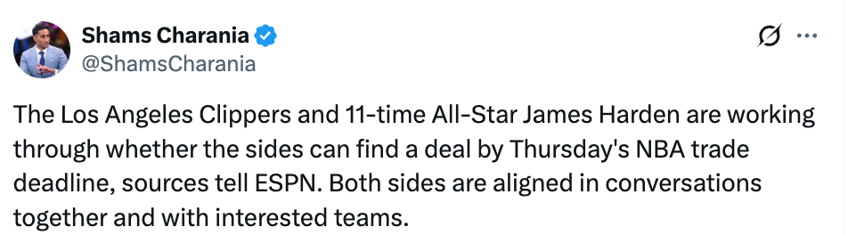 2026-02-03 13:40北京时间2月3日,据名记Shams报道,ESPN消息人士透露,洛杉矶快船队与 哈登正在探讨,能否在周四的NBA交易截止日前达成交易方案,目前双方在对话中立场一致,且均在与其他有意向的球队进行接触。Rob Murrows跟进报道,火箭和骑士是两支在认真考虑交易得到哈登的球队!