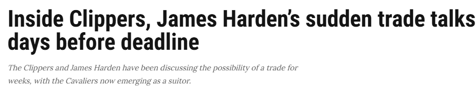 尽管交易谈判一直在进行,但哈登在此期间始终留在球队阵容中,几乎出战了快船队的所有比赛。不过双方达成了共识,都会尝试在2月6日NBA交易截止日前促成一笔交易。