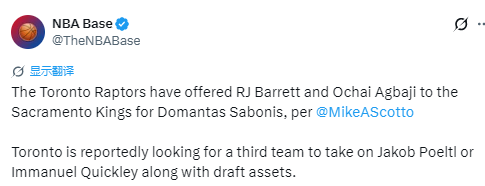 2026-02-04 00:00北京时间2月3日,据记者Michael Scotto报道,猛龙已向国王开出巴雷特加阿巴基的筹码,报价换取小萨博尼斯。另有报道称,猛龙正寻求引入第三方球队,搭配选秀权交易珀尔特尔或奎克利。
