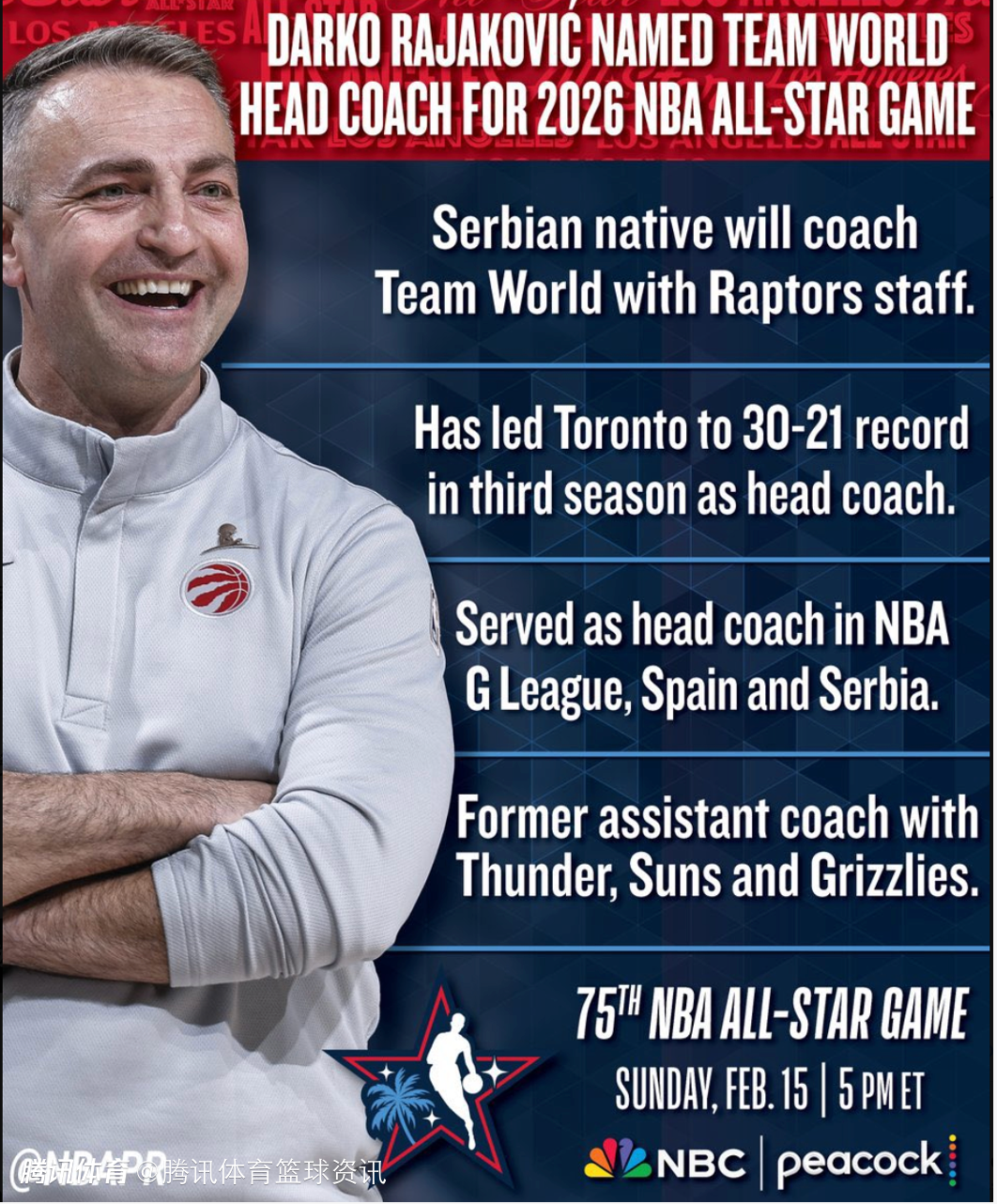 2026-02-04 00:50北京时间2月4日,NBA官方宣布,猛龙主帅拉贾科维奇被任命为2026年NBA全明星世界队主帅。