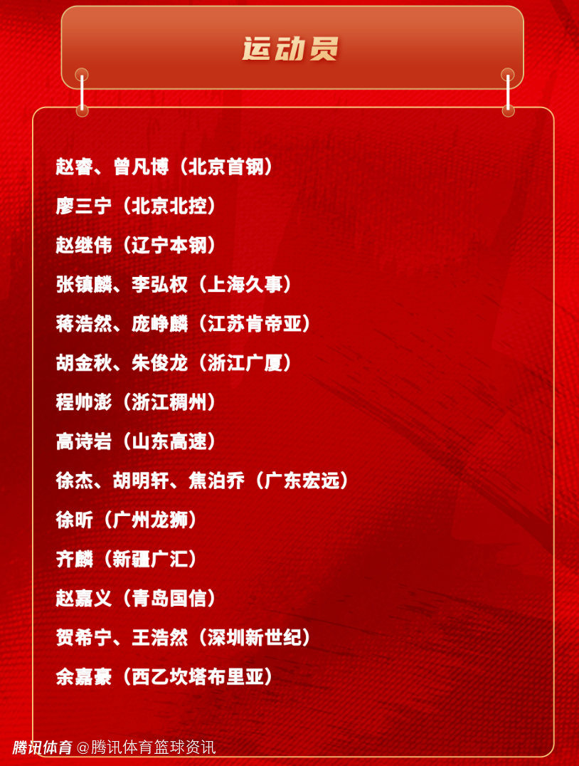 赵睿、曾凡博(北京首钢),廖三宁(北京北控),赵继伟(辽宁本钢),张镇麟、李弘权(上海久事)蒋浩然、庞峥麟(江苏肯帝亚),胡金秋、朱俊龙(浙江广厦),程帅澎(浙江稠州),高诗岩(山东高速),徐杰、胡明轩、焦泊乔(广东宏远),徐昕(广州龙狮),齐麟(新疆广汇),赵嘉义(青岛国信),贺希宁、王浩然(深圳新世纪),余嘉豪(西乙坎塔布里亚)。
