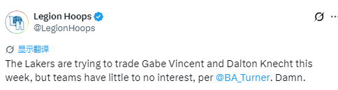 2026-02-04 06:00北京时间2月4日,据LA Times记者Brad Turner报道,湖人本周试图交易文森特与克内克特,但各支球队几乎毫无兴趣。