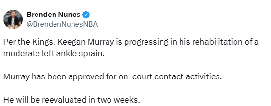 国王官方:基根-穆雷已恢复场上对抗训练 两周后接受复查