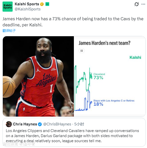预测数据平台Kalshi Sports显示,骑士是哈登去向的最大热,而且哈登在交易截止日期前被交易到骑士的概率高达73%。