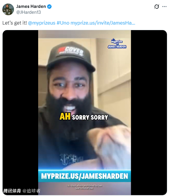今日哈登发推宣传社交与游戏平台MyPrize,视频中哈登面带微笑,手舞足蹈,心情大好,正在与品牌的互动界面和游戏元素进行互动。