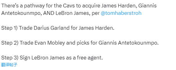 骑士好像正在下一步大棋,Tom Haberstroh表示,骑士队有一条途径可以同时得到哈登、字母哥和詹姆斯;第一步用达里厄斯-加兰换来詹姆斯-哈登;第二步用埃文-莫布里和选秀权换来字母哥;第三步今夏以自由球员身份签下勒布朗-詹姆斯。