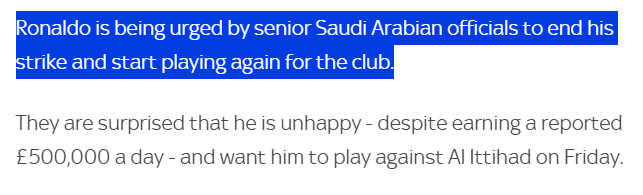 此外,沙特高层他们对C罗竟然会不高兴,感到十分惊讶,因为C罗拿着超高的薪水,并且在沙特联赛享有特权。
