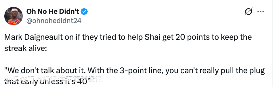 谈及是否会刻意帮助亚历山大拿到20分,以延续他的得分纪录,戴格诺特表示:“我们不会讨论这种事。在有三分线的现代篮球里,除非领先到40分,否则你没法真的提前打卡下班。”本场比赛亚历山大拿到20分5篮板9助攻,连续121场比赛拿到20+,距离追平张伯伦(26场)保持的历史纪录还差5场。