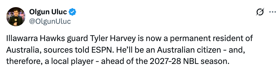 2026-02-04 15:40北京时间2月4日,据ESPN记者Olgun Uluc报道,澳洲NBL的伊拉瓦拉老鹰队后卫,同时也是上赛季效力上海的外援泰勒-哈维现已获得澳大利亚永久居留权。他将在2027-28赛季NBL联赛开始前获得澳大利亚公民身份,从而以本土球员的身份参赛。