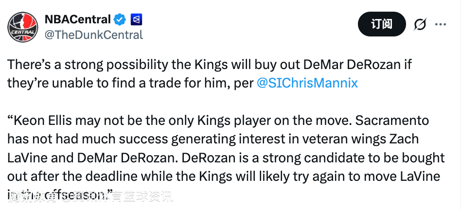 2026-02-04 23:30北京时间2月4日,据美记Chris Mannix报道,如果国王队无法为德罗赞找到交易下家,他们极有可能会买断他的合同。另外他也表示,如果德罗赞成为自由球员,湖人和快船会对他非常感兴趣。