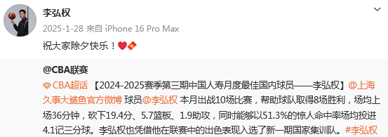 2025年1月,李弘权凭借12月的月度最佳表现,代表上海出战10场比赛,取得8胜2负的战绩,场均上场36分钟,砍下19.4分、5.7篮板、1.9助攻,同时能够以51.3%的惊人命中率场均投进4.1记三分球。李弘权也凭借他在联赛中的出色表现入选了新一期国家集训队。