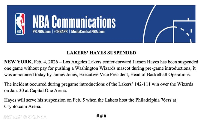 这起事件发生在1月31日湖人以142比111大胜奇才的比赛赛前。NBA官方宣布,海斯将被处以禁赛一场、无薪处罚。