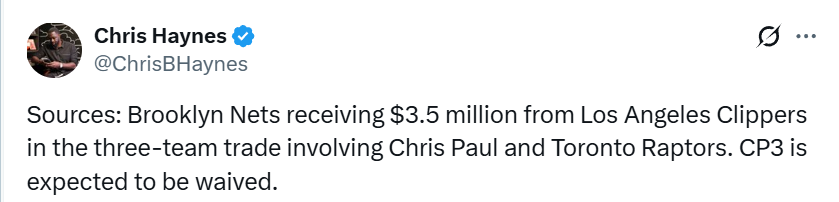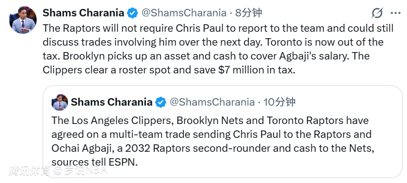 2026-02-05 05:10北京时间2月5日,据名记Shams报道,快船、篮网和猛龙达成了一笔关于保罗的三方交易。具体内容如下——