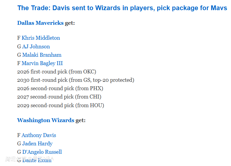 2026-02-05 05:30北京时间2月5日,安东尼-戴维斯在达拉斯的时代正式落幕,距离达拉斯独行侠用卢卡-东契奇从洛杉矶湖人队换来这位十届全明星球员、震惊整个联盟,仅仅过去了一年时间。独行侠与奇才达成了一笔4换9的交易,具体内容如下——