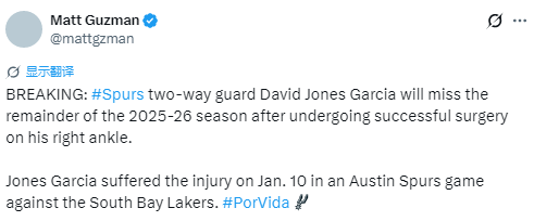 2026-02-05 06:40北京时间2月5日,根据马刺队记Matt Guzman的报道,马刺双向合同后卫大卫-琼斯-加西亚右脚踝手术成功,将缺席2025-26赛季剩余所有比赛。琼斯-加西亚于1月11日在奥斯汀马刺对阵南湾湖人的比赛中遭遇该伤势。