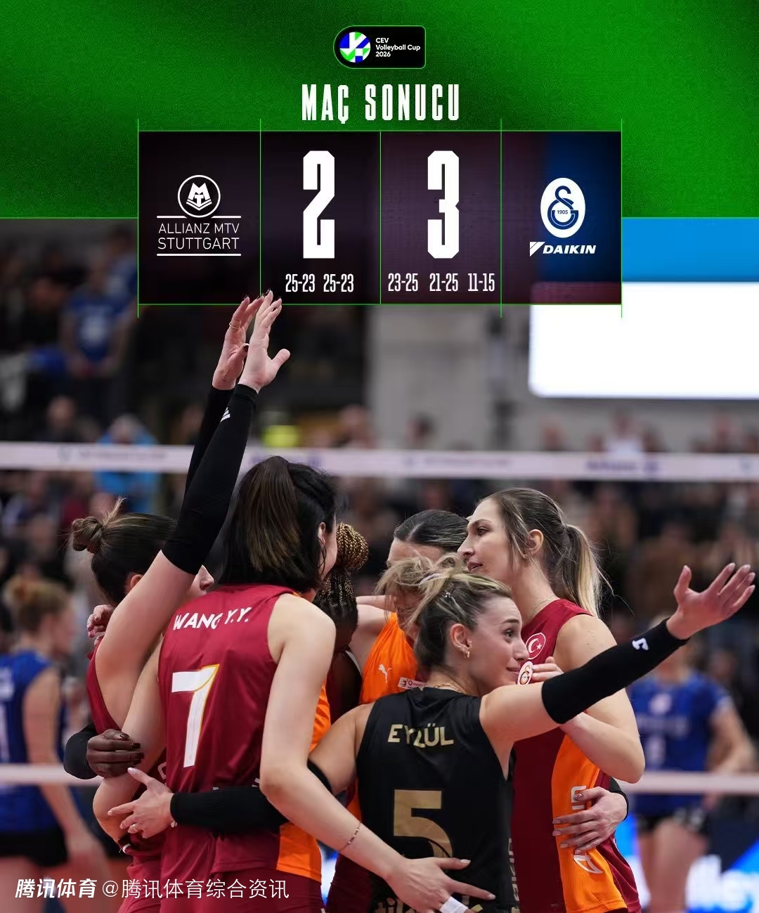 2026-02-05 08:20北京时间2月5日,女排欧联杯八强附加赛第二回合,加拉塔萨雷客场在以两个23-25背水一战的情况下连扳三局,以3-2(23-25/23-25/25-21/25-23/15-11)大逆转斯图加特,两回合双杀对手,晋级八强,将在1/4决赛对阵从欧冠小组第三法国巴黎。