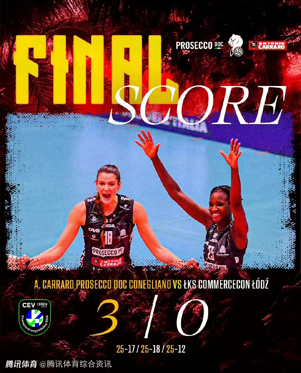 2026-02-05 08:30北京时间2月5日,2026女排欧冠正赛小组赛最后一轮,D组的意大利科内利亚诺以3-0(25-17, 25-18, 25-12)横扫波兰罗兹ŁKS,小组赛全胜列头名晋级八强。
